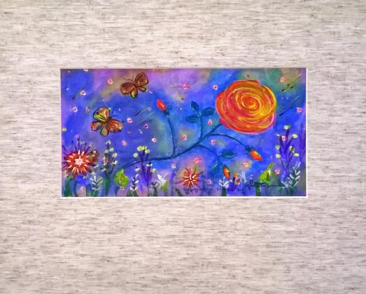 AN ENCOUNTER IN THE GARDEN silk printing overpainted with oil paint, on a burlap frame 34 x 43 cm